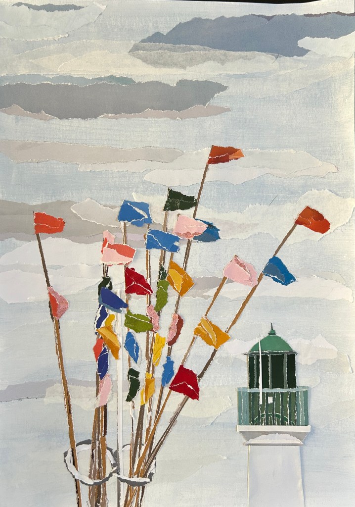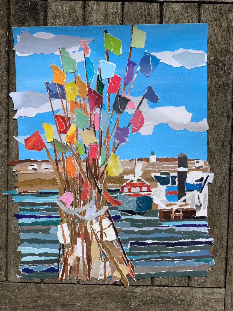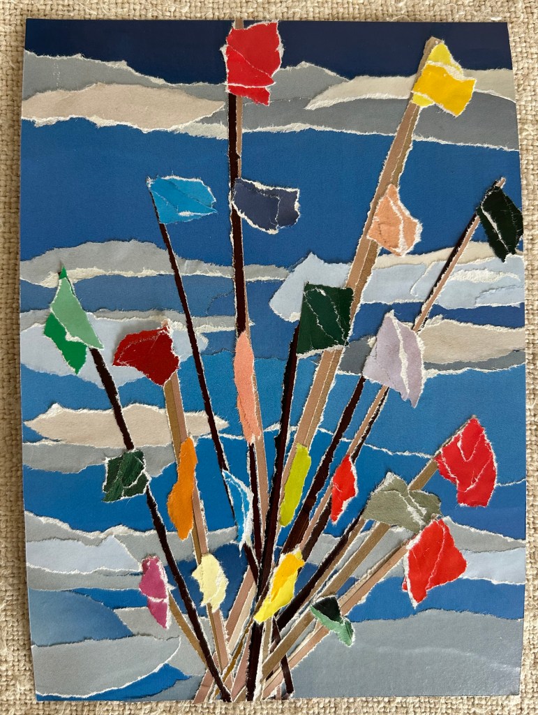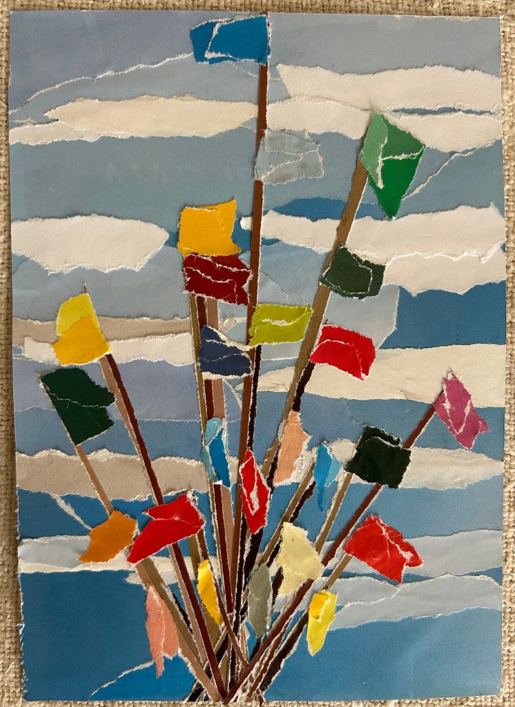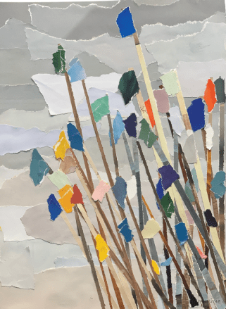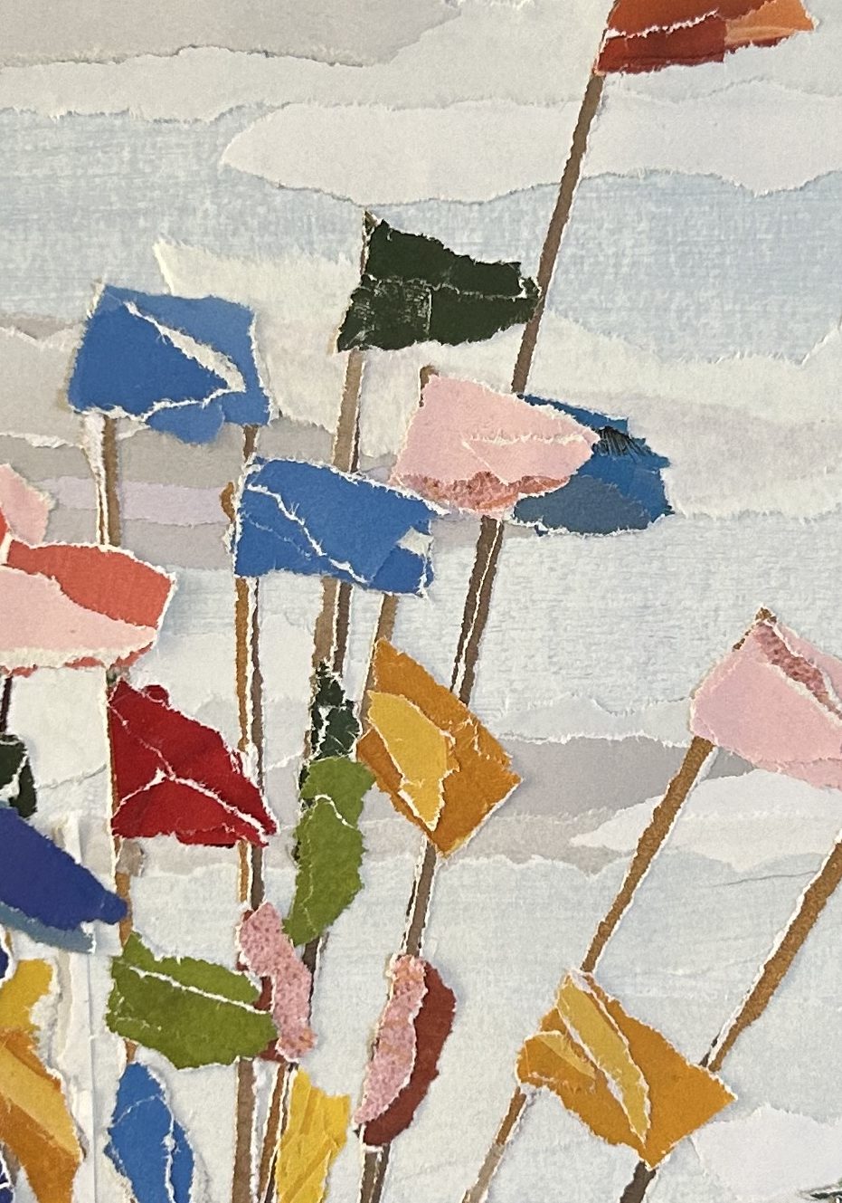 Papier de magazines recyclés déchirés puis collés sur papier Canson épais.