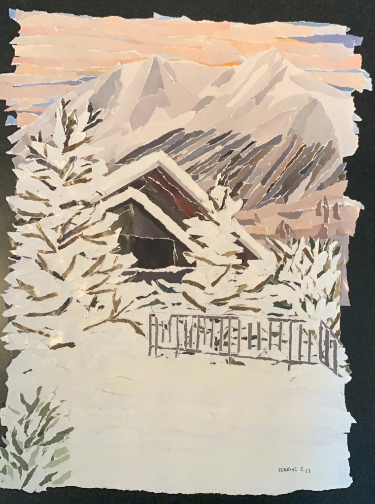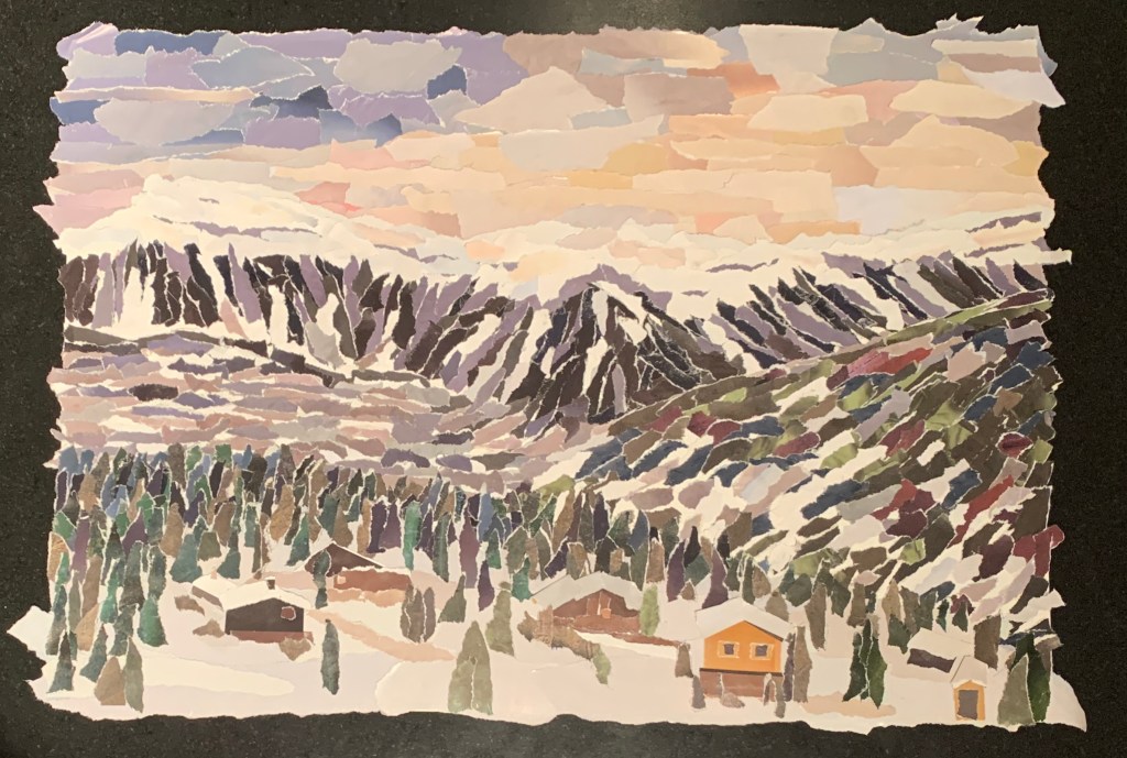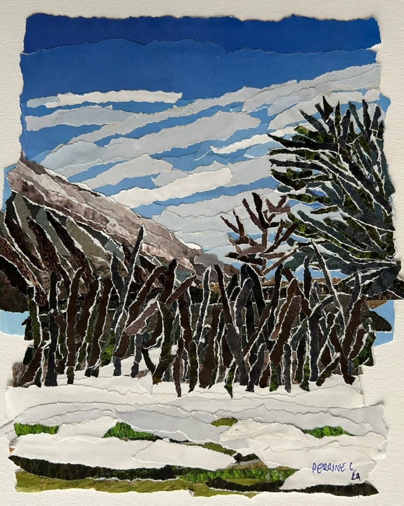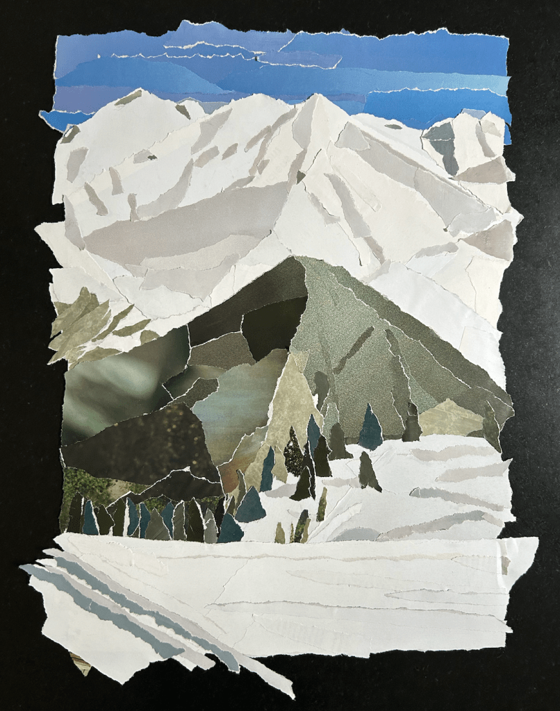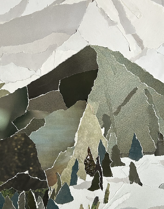 Papier de magazines recyclés déchirés puis collés sur papier Canson épais.