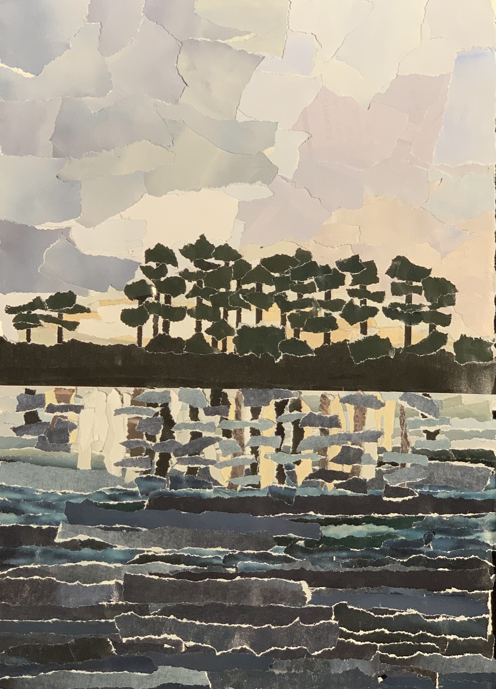 Papier de magazines recyclés déchirés puis collés sur papier Canson épais.